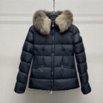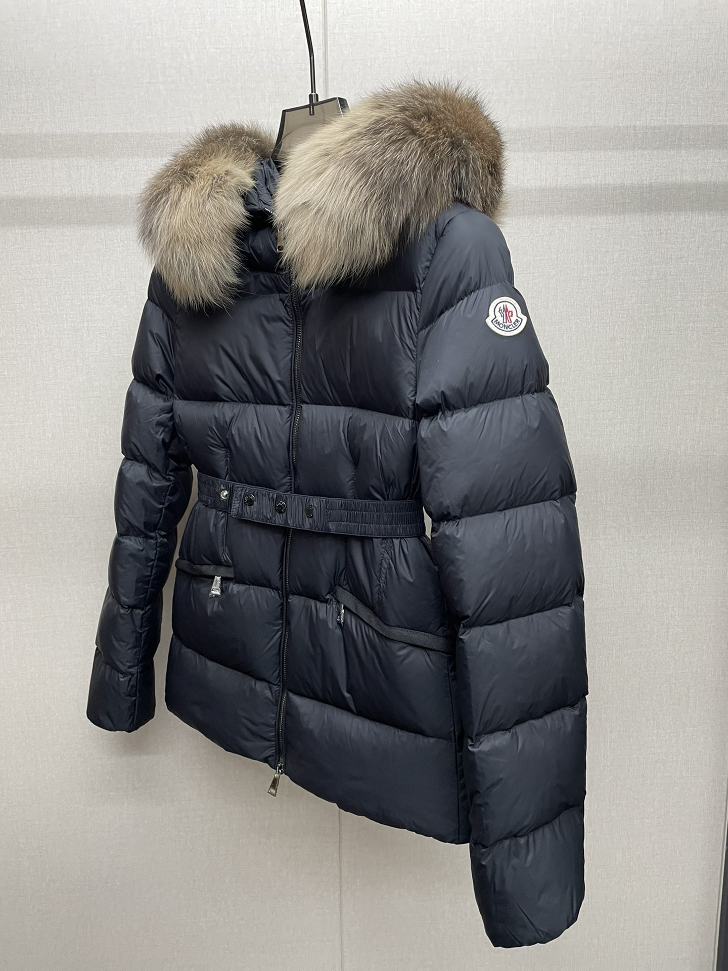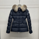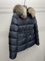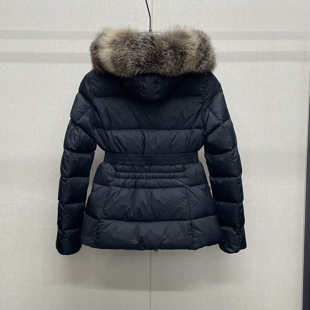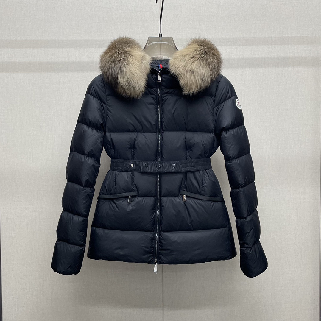 Mone~r’s fashionable waisted fur collar down jacket features nylon Leger sculptural line design, down filling and signature Boudin quil seams. Stretch straps at the waist give you a slim and feminine look. A zipper closure with dual zipper pulls and a removable frost fox edge on the hood let you customize the style to suit your climate and needs.